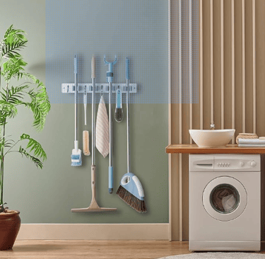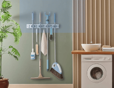 Wall-Mounted Organizer: A simple wall-mounted rack with clips and hooks (like the one holding the brooms and mops) gets all your cleaning long-handled tools off the floor. This immediately clears visual clutter and makes it easier to clean the laundry room floor itself.