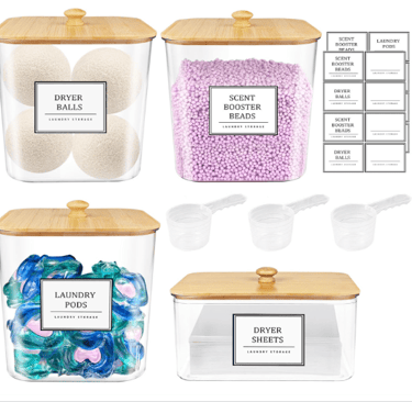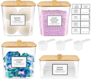Airtight Storage Jars: Invest in clear, stackable containers with bamboo lids (like the set shown with the Laundry Pods and Scent Booster Beads). These containers do three amazing things: they look incredibly tidy, they make it easy to see when you're running low, and they keep supplies fresh and safe. Don't forget the dryer sheets and dryer balls for a complete, organized look!
