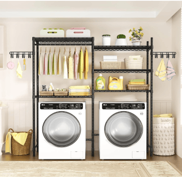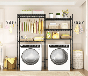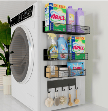 Over-The-Washer Rack: Look for a heavy-duty, adjustable shelving unit (like the tall black wire rack pictured). This piece instantly creates three to four levels of storage for bulk items, neatly folded clothes, and baskets. The integrated hanging rods are perfect for air-drying delicates or hanging clothes immediately out of the dryer—a huge time-saver!