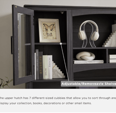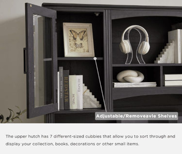 The Hutch Advantage: The upper hutch is the hero for keeping your desktop clear. With multiple cubbies and shelves, you can sort and display items beautifully. Use the glass-front cabinets for keeping dust off decorative items or reference books and use the open cubbies for displaying motivational pieces or frequently used manuals.